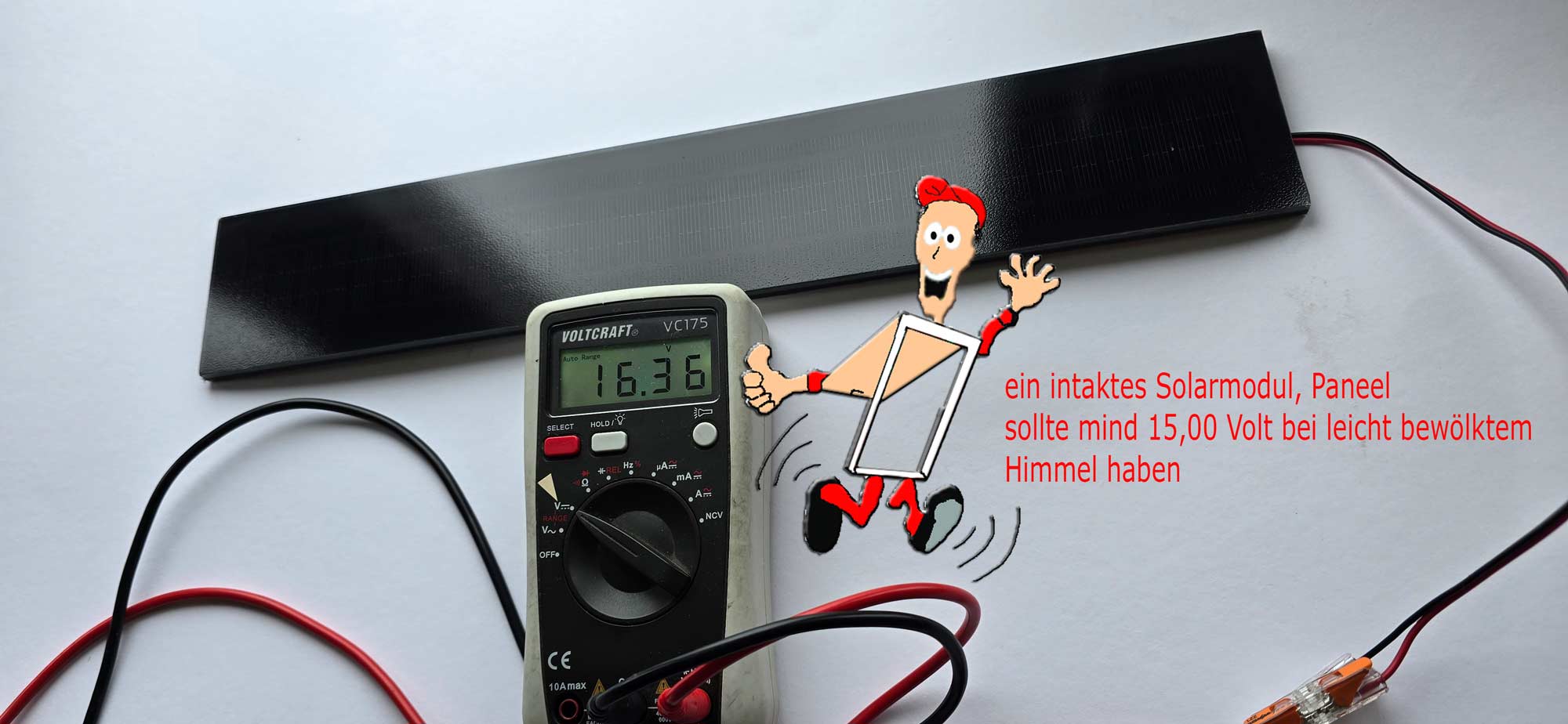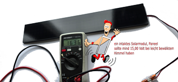 Ein Neues Solarpanel hat ca. 15,0 Volt Leistung im Schatten, bei Sonne sollte der Wert auf über 20,0 Volt ansteigen.