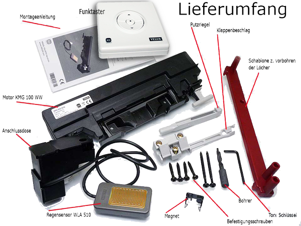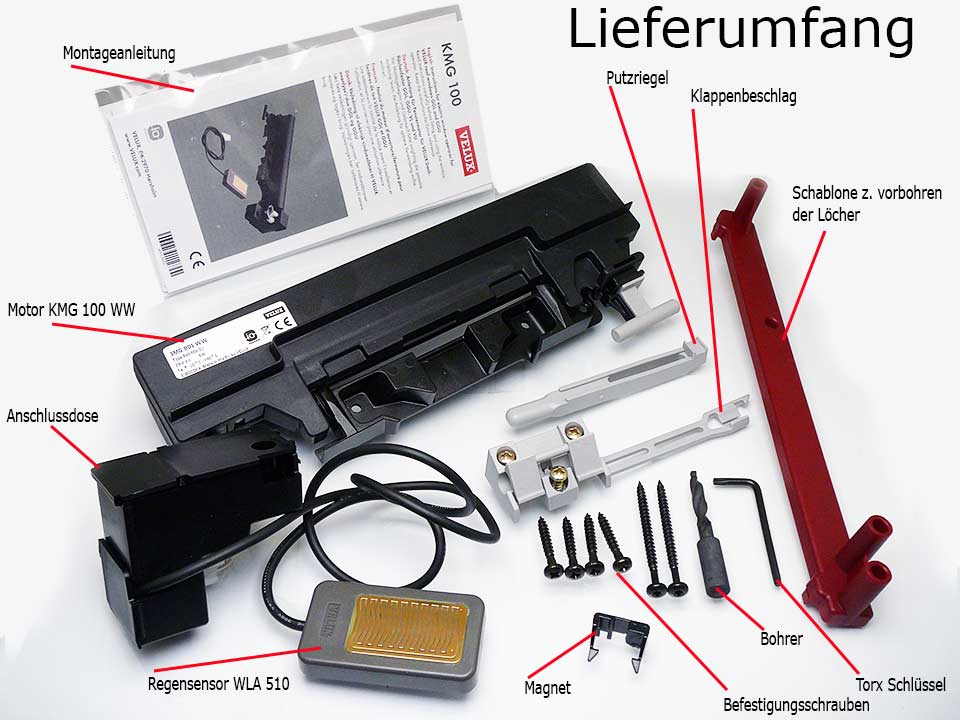 Bestehend aus Original Velux Fenster Motor (Öffner), Anschlussbox, Regensensor, Funkwandtaster und Montageteilen