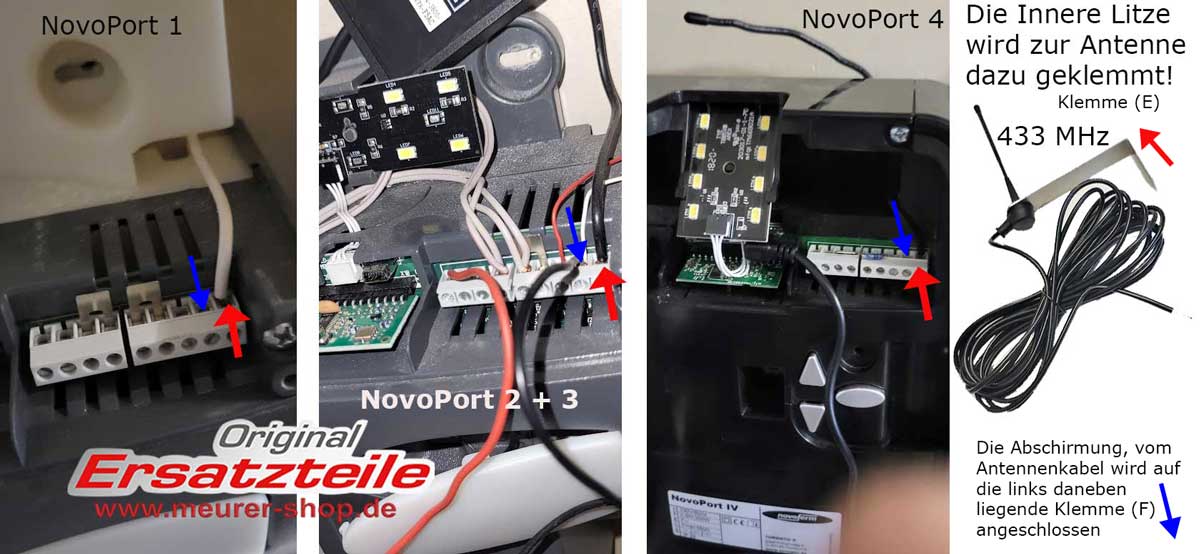 wird einfach mit der Inneren Litze vom Antennenkabel auf Klemme (E), Abschirmung außen, auf Klemme (F) an Ihre Steuerung oder Funkplatine am Antennenausgang angeschlossen!
